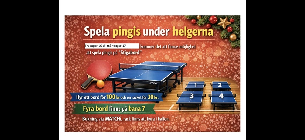 Pingisborden står framme för bokningar från fredag eftermiddagar 16:00 till måndagar 16:00. Bokas via matchi, där borden bokas som bana 12-15. Borden är märkta med nr. Racketar finns att hyra i hallen.